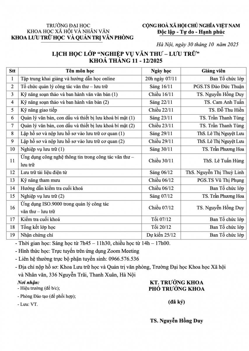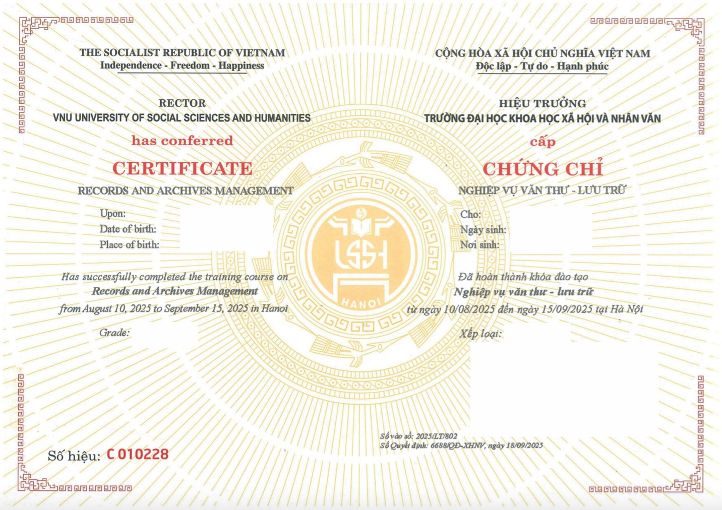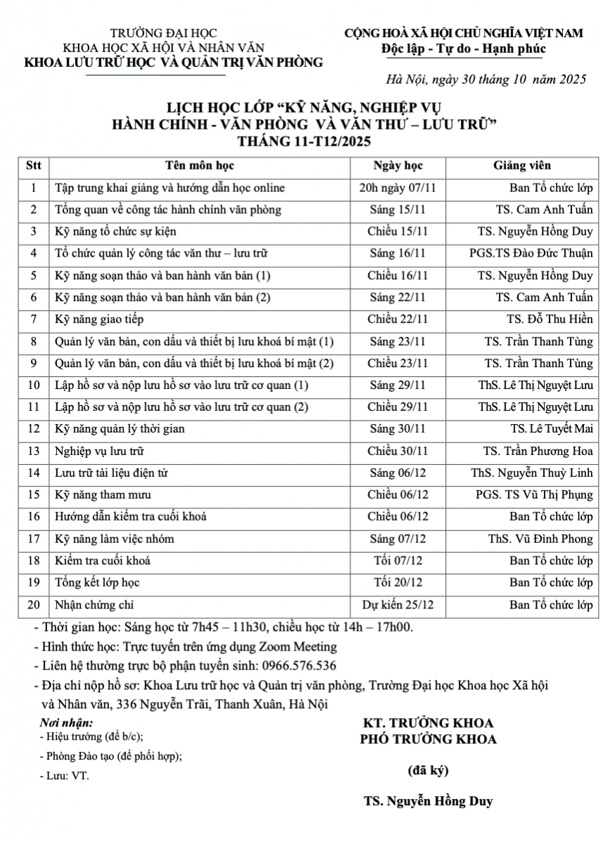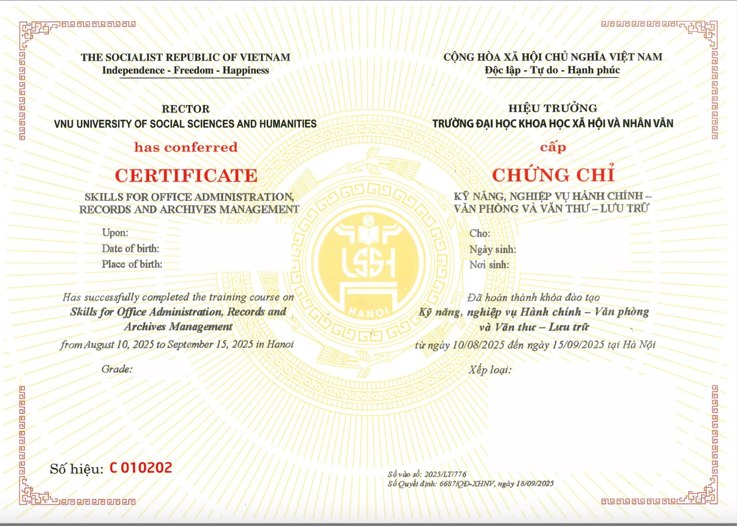 Nhằm đáp ứng nhu cầu chuẩn hóa và bồi dưỡng, nâng cao trình độ trong lĩnh vực hành chính - văn phòng và văn thư - lưu trữ tại các cơ quan, tổ chức, doanh nghiệp ở trung ương và địa phương, Trường Đại học Khoa học Xã hội và Nhân văn, Đại học Quốc gia Hà Nội trân trọng thông báo về kế hoạch tuyển sinh khoá đào tạo cấp chứng chỉ “Kỹ năng, nghiệp vụ Hành chính - Văn phòng và Văn thư - Lưu trữ” và khoá “Nghiệp vụ Văn thư – Lưu trữ” tháng 11-12/2025.